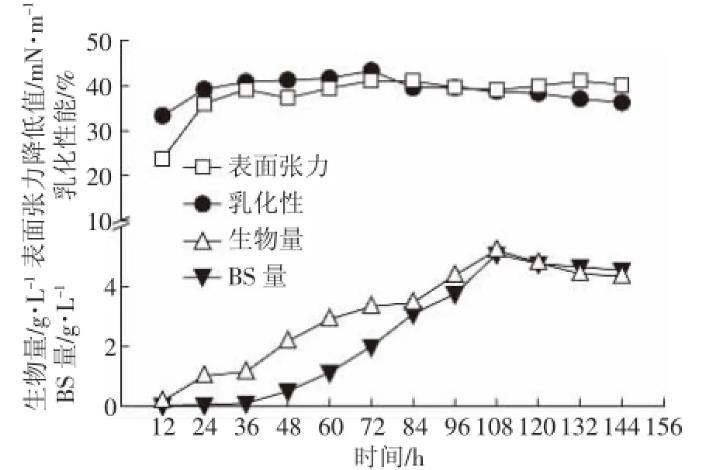 在上述花生油25 mL·L-1為碳源、硫酸銨1 g·L-1為氮源、NaCl濃度為5 g·L-1、pH=8、溫度保持為30℃的最佳培養條件下,追蹤細菌147的發酵動態(圖7)。菌株經過短暫的延滯期后進入對數生長期,108 h后進入穩定增長期,此時菌體所產生的生物表面活性劑含量達到最大,此后生物表面活性劑含量減少,可能是因為后期培養基內的碳源已經用盡,細菌開始以胞外分泌物糖脂為碳源維持生命。而表面張力值與乳化性在24 h后達到最大,之后維持在穩定水平,說明細菌在24 h后產生的生物表面活性劑已到達生物表面活性劑的臨界膠束濃度,此后生物表面活性劑產量還會增加,但是表面張力降低值與乳化性只維持在一定范圍內波動。