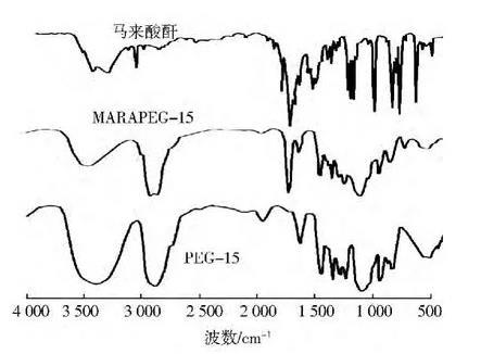 在MARAPEG-15曲線中,不存在酸酐中羰基C═O對稱和反對稱偶合振動吸收峰(1 783,1 856cm-1)以及C—O—C伸縮振動特征峰(1 268cm-1),也不存在羧酸的—OH的伸縮振動峰(3 000cm-1)以及共軛羧酸C═O的特征峰(1 620cm-1),不存在蓖麻油酸中仲羥基特征峰(1 124cm-1),而存在與羰基共軛的C═C特征峰1 643cm-1,說明馬來酸酐與蓖麻油酸上的仲羥基進行了酯化反應。1 732cm-1處為蓖麻油酸的酯羰基的伸縮振動峰,3 460cm-1處為醇羥基—OH特征峰,1 249cm-1處為伯醇的C—O伸縮振動峰,2 925cm-1處為甲基、亞甲基伸縮振動峰,1 111cm-1處為聚乙二醇中的醚鍵特征峰。以上分析說明產物結構為MARAPEG-15。