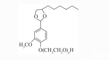 香蘭素基聚氧乙烯醚left(VAEO_n,n=10right.、20,由香蘭素與辛二醇在磷酸催化下生成香蘭素辛二醇縮醛,再與環氧乙烷開環加成聚合反應得到,純度95%),其EO聚合度呈泊松分布。