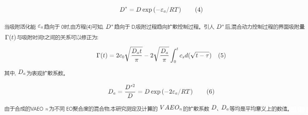 擴散控制的吸附過程,表面活性劑分子由濃度差驅使進入新表面,不存在吸附勢壘。Word-Tordai方程描述了界面吸附量Г(t)與吸附時間t的關系:Г(t)=2c0Dtπ-2Dπ∫t0csd(t-τ)(1)式中,c0是溶液本體表面活性劑濃度,mol/L,D是單分子擴散系數,m2/s,cs是次表面表面活性劑濃度,mol/L,τ是整合虛設變量。方程(1)不能直接求解,可通過極限法求解。在t→0時,表面張力γ(t)近似于溶劑表面張力γ0,表面吸附接近平衡時,γ(t)近似于靜態表面張力γeq.Fainerman等用漸近的方法對方程(1)進行轉化:γ(t→0)=γ0-2nRTc0Dtπ(2)γ(t→∞)=γeq+nRTГ2eqcπ4Dt(3)方程(3)中,t→∞時,c=c0,Γeq表示靜態表面張力達到平衡時的表面吸附量?;旌蟿恿U散吸附是指表面活性劑分子從本體擴散到次表面仍然遵循擴散機理,但從次表面層擴散到表面層時需克服一定的勢壘。Liggieri和Ravera[15,16]提出,次表面層中的分子,只有能量大于吸附活化能εa才能被吸附到表面,已吸附的分子,只有能量大于解吸活化能εb才能被解吸。以Word-Tordai方程為基礎,引入矯正擴散系數D?。矯正擴散系數D?和擴散系數D關系定義為:D?=Dexp(——εa/RT)(4)當吸附活化能εa趨向于0時,由方程(4)可知,D?趨向于D,吸附過程趨向擴散控制過程。引入D?后,混合動力控制過程的界面吸附量Г(t)與吸附時間t之間的關系可以修正為:Г(t)=2c0Datπ-2Daπ∫t0csd(t-τ)(5)其中,Da為表觀擴散系數。Da=D?2D=Dexp(——2εa/RT)(6)由于合成的VAEOn為不同EO聚合度的混合物,本研究測定及計算的VAEOn的擴散系數D、Da等均是平均意義上的數值。