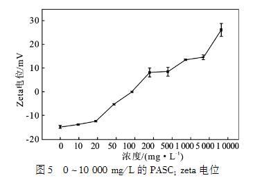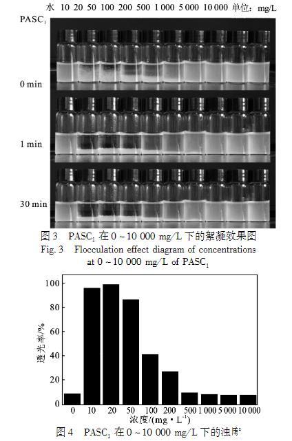 PASC1的絮凝效果見圖3、圖4.PASC1濃度為10——50mg/L時,透過率接近100%,繼續(xù)增加PASC1的濃度,體系重新變得渾濁。隨著PASC1濃度的進一步增加,體系的透過率降低,粘土顆粒懸浮體系重新穩(wěn)定。粘土顆粒的表面由于同構取代而帶負電荷,這意味著需要陽離子達到電荷平衡。對于鈉基膨潤土(Na——BT),Na+離子被吸引到層空間中。當Na——BT與水接觸時,水可進入晶層內(nèi)部,使可交換陽離子解離,在晶層表面建立擴散雙電層,從而產(chǎn)生負電性。
