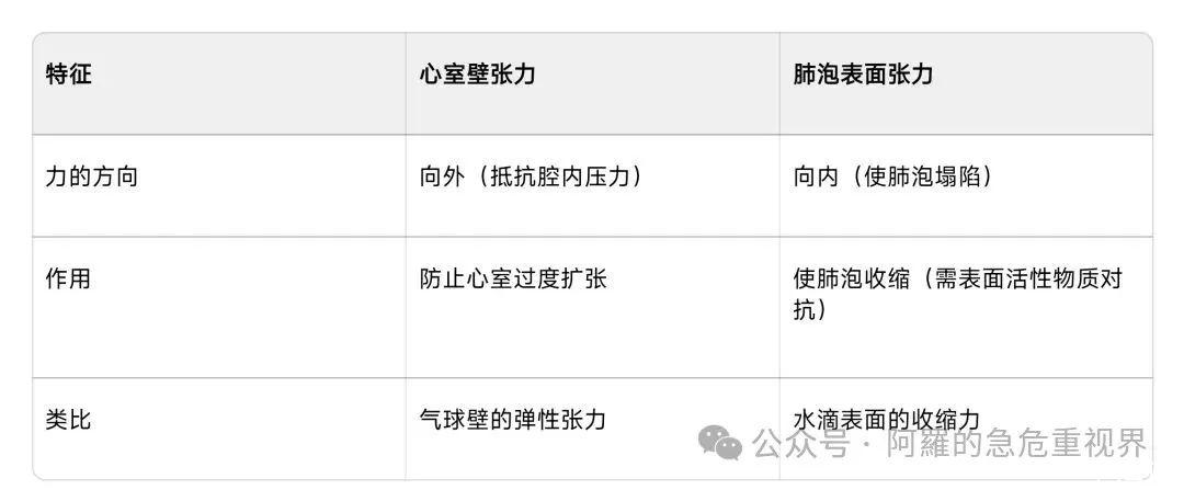 三、這兩種力的方向相反心室壁張力:把心臟想成一個氣球,心室壁張力就像氣球壁被里面的氣往外撐,方向是從里朝外、一圈圈地繞著球壁,幫助把血“擠”出去。肺泡表面張力:肺泡像極小的肥皂泡,表面張力就像肥皂膜總想把自己縮成最小,力的方向全是朝著泡中心,想把泡“掐”癟。一個向外推血,一個向內掐泡。