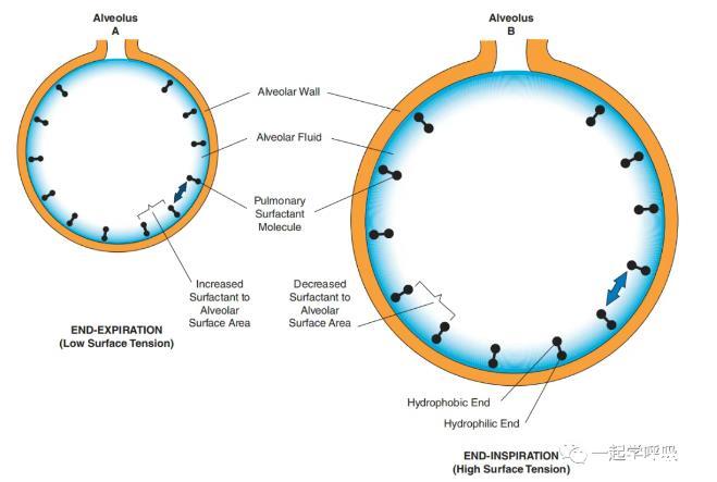 ▲肺泡Laplace定律的示意模型。理想球形肺泡的內壓由Laplace定律定義為ΔP=2γ/r。因此,小半徑的肺泡(肺泡1)相對于大半徑的肺泡(肺泡2)具有更高的內壓。在沒有功能性表面活性劑膜的情況下,肺泡1傾向于向肺泡2塌陷,這就允許了肺泡大小的不均勻性。然而,在表面活性劑的存在下,由于水-水-和水-空氣相之間均勻產生分子間力,避免了氣-液界面的彎曲并避免了肺泡塌陷,表面張力降低。LS是肺表面活性劑。