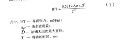 采用芬蘭Kibron dIFT雙通道動(dòng)態(tài)界面張力儀進(jìn)行界面張力測定。此張力儀的原理是:液滴通過旋轉(zhuǎn)處于一定的離心場中,這時(shí)兩種液體之間的界面張力及旋轉(zhuǎn)的速度就決定了液滴的形狀,液滴的平衡形狀通過調(diào)整轉(zhuǎn)速得到改變,而使液滴以一定的角速度自轉(zhuǎn),這時(shí)通過離心力、重力以及界面張力的三種力量的共同作用下,在高密度的液體中,低密度的液滴能夠形成圓柱形或長橢球形液滴。這種方法可以測定出10-6mN/m的超低界面張力。