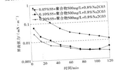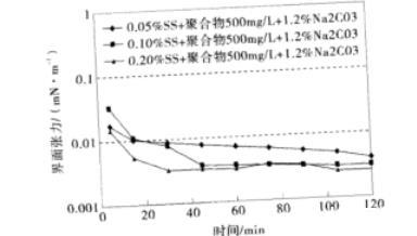 圖1石油磺酸鹽+聚合物500 mg/L+1.2%Na2CO3復(fù)配體系的動(dòng)態(tài)界面張力(mN/m)