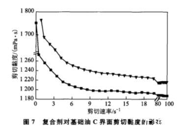 圖7復(fù)合劑對基礎(chǔ)油C界面剪切黏度的影響