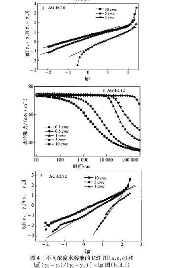 在25cc下測定不同濃度AG.EC水溶液的DST,并利用Rosen模型處理,得到其動態(tài)表面張力參數(shù),見圖4、表1。