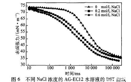 平衡張力研究表明,三種烷基糖苷檸檬酸單酯鹽在其各自的水溶液中均具有表面活性。動態(tài)表面張力研究表明,同摩爾濃度AG—EC08、AG.ECIO和AG—EC12水溶液的動態(tài)表面活性在達到一定時間后隨表面活性劑分子的疏水鏈增長而不斷增大;AG—EC溶液的濃度越高,其動態(tài)表面活性越好,DST越快平衡,DST曲線越低。而當溫度升高,其DST明顯下降;無機電解質NaC1對其DST的影響也較明顯,隨著NaC1濃度增大,其DST曲線越低。