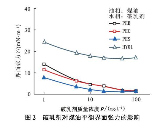陽離子破乳劑對原油界面張力的影響呈現獨特的規律,但其質量濃度低于50 mg·L-1時,界面張力始終處于一個略低于單獨1 000 mg·L-1PPG界面張力的平臺值,說明此時HY01分子主要與溶液中的PPG分子發生作用,只有少量的HY01與界面上的PPG分子發生作用;但質量濃度達到100 mg·L-1時,HY01分子在界面上與帶負電荷的PPG分子混合吸附,造成界面張力明顯降低。在較寬的中間質量濃度范圍內,界面張力保持不變,意味著此時界面層上HY01分子已經飽和,這與反電荷的聚電解質與表面活性劑相互作用的普遍結果是一致的。