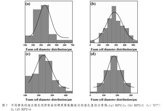 為了對(duì)聚氨酯泡沫孔徑大小和分布情況進(jìn)行量化,通過ImageJ軟件對(duì)SEM測(cè)試結(jié)果進(jìn)行處理分析,其孔徑分布直方圖如圖7所示。通過泡沫的孔徑分布直方圖對(duì)比結(jié)果可以看出,添加國(guó)產(chǎn)-1的聚氨酯泡沫孔徑分布范圍在100~700μm,存在較大直徑的泡孔,添加進(jìn)口-2的聚氨酯泡沫泡孔直徑分布范圍在0~550μm,雖然分布范圍有變窄,但也存在較大泡孔直徑,添加PAVE-5的聚氨酯泡沫泡孔直徑分布范圍在100~450μm,泡孔分布范圍減小,但仍然存在超過400μm的大泡孔,分布范圍最窄的是添加PGVF-6泡沫穩(wěn)定劑的硬質(zhì)聚氨酯泡沫,分布范圍在0~300μm,沒有超過400μm直徑的泡孔,泡沫泡孔直徑得以減小,泡沫泡孔細(xì)小均勻。這種微觀結(jié)構(gòu)上的改善可能得益于在發(fā)泡過程中,接枝APEG的POSS可以作為三維網(wǎng)絡(luò)結(jié)構(gòu)的交聯(lián)點(diǎn),通過其與聚氨酯基體的相容性,親水性-OH基團(tuán)有助于形成更加穩(wěn)定的泡沫結(jié)構(gòu)。
