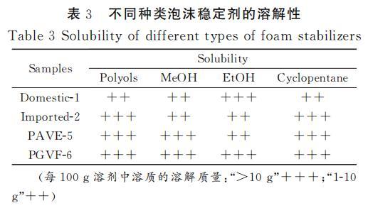 聚氨酯發(fā)泡過程中,各原料之間的相容性對(duì)泡沫的性能有重要影響。相容性好的原料可以確保發(fā)泡過程中的化學(xué)反應(yīng)順利且充分進(jìn)行,從而獲得均勻、細(xì)膩的泡沫結(jié)構(gòu),提高泡沫的物理性能和使用性能。表3是不同種類泡沫穩(wěn)定劑在不同溶劑中的溶解性測(cè)試,通過測(cè)試結(jié)果可知,經(jīng)過接枝改性后的PAVE-5和PGVF-6在多元醇和環(huán)戊烷中的溶解性較好,和國(guó)產(chǎn)-1、進(jìn)口-2等泡沫穩(wěn)定劑都能夠很好的溶解在多元醇和環(huán)戊烷中。PGVF-6和PAVE-5在多元醇中表現(xiàn)出的優(yōu)良溶解性主要得益于POSS接枝的APEG鏈段的醚鍵和羥基都具有明顯的極性,這使得其分子間以及與其他極性分子間可以形成較強(qiáng)的極性相互作用。這種相互作用有助于分子間的相容性,對(duì)聚氨酯泡沫的形成和性能有積極作用。