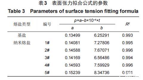 利用拉筒法對配制的基鹽及5種加入30nm SiO2納米顆粒的納米熔鹽的表面張力進行測量,每隔10℃進行一次測量,對得到的實驗數據進行整理和分析,擬合公式以及擬合系數見表3。