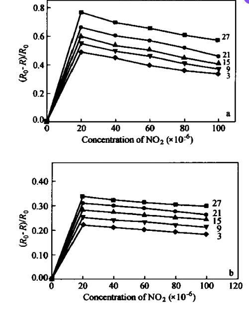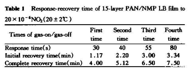 在敏感特性的測(cè)試過程中,我們發(fā)現(xiàn)純聚苯胺LB膜對(duì)NO?具有較好的敏感性。聚苯胺LB膜的敏感性及響應(yīng)時(shí)間與LB膜的層數(shù)有密切關(guān)系。隨層數(shù)的增加,對(duì)NO?的響應(yīng)時(shí)間逐漸增長(zhǎng),這可以從圖4中看出。