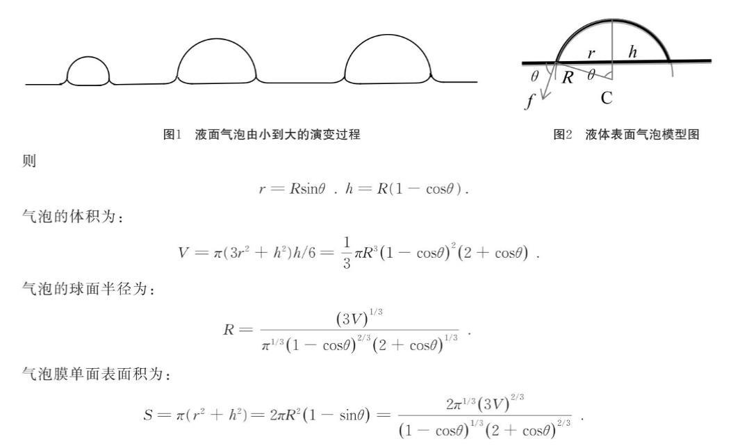 氣泡一般是由于氣體通過小孔浸人液體層后分散擴張形成的.在氣泡形成過程中,由于液體表面張力的作用,使液膜呈收縮趨勢.球形氣泡的液膜表面積最小,所以,在沒有其他因素影響的條件下,空中和液體中的氣泡應處于球形的亞穩狀態.當氣泡落在液體表面或由液體內部上升到液體表面以后,沒破裂的氣泡不再呈現.球形狀態,與液體表面直接形成的氣泡一樣,呈現球缺形狀.液面氣泡由小到大的演變過程如圖1所示.當氣泡足夠大時,液體表面氣泡實際形狀接近半球,但在氣泡與液體表面接觸處可觀察到氣泡內、外均存在液面向上彎曲現象,且泡內水平液面相比氣泡外水平液面位置出現微小凹陷.