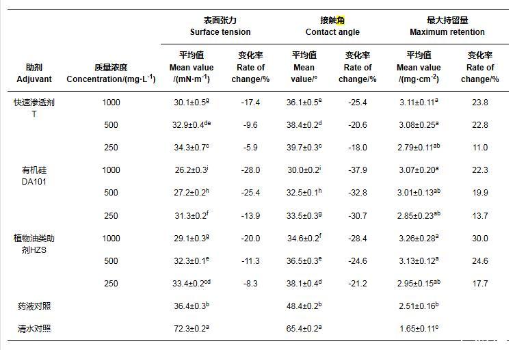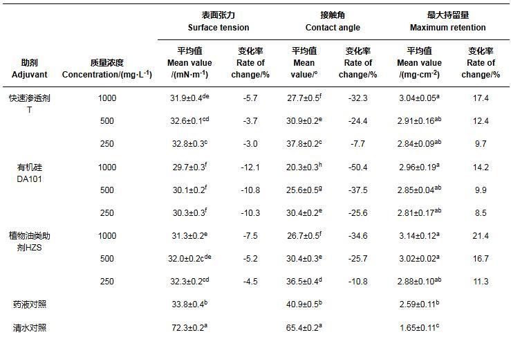 2.1添加噴霧助劑后藥液理化性質(zhì)(表面張力、葉面接觸角)的變化