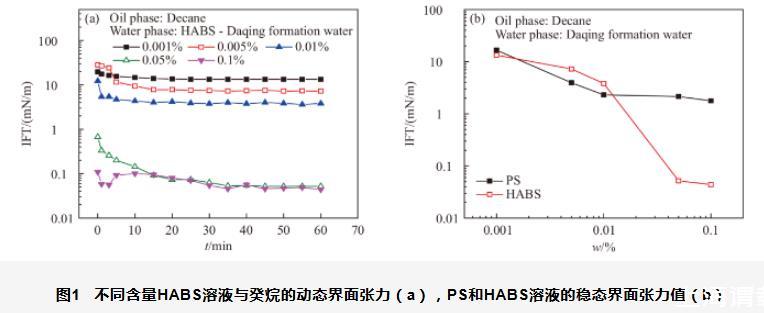 圖1不同含量HABS溶液與癸烷的動態界面張力(a),PS和HABS溶液的穩態界面張力值(b)