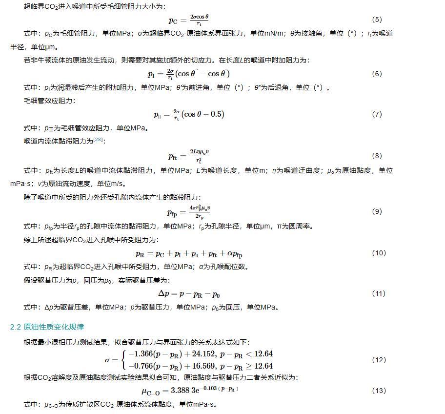 由于各個(gè)油藏的實(shí)際情況存在差異,因此該模型應(yīng)用的過(guò)程中需要結(jié)合油藏最小混相壓力、喉道尺寸分布公式、驅(qū)替壓力與界面張力的關(guān)系表達(dá)式、原油黏度與驅(qū)替壓力的關(guān)系表達(dá)式等。
