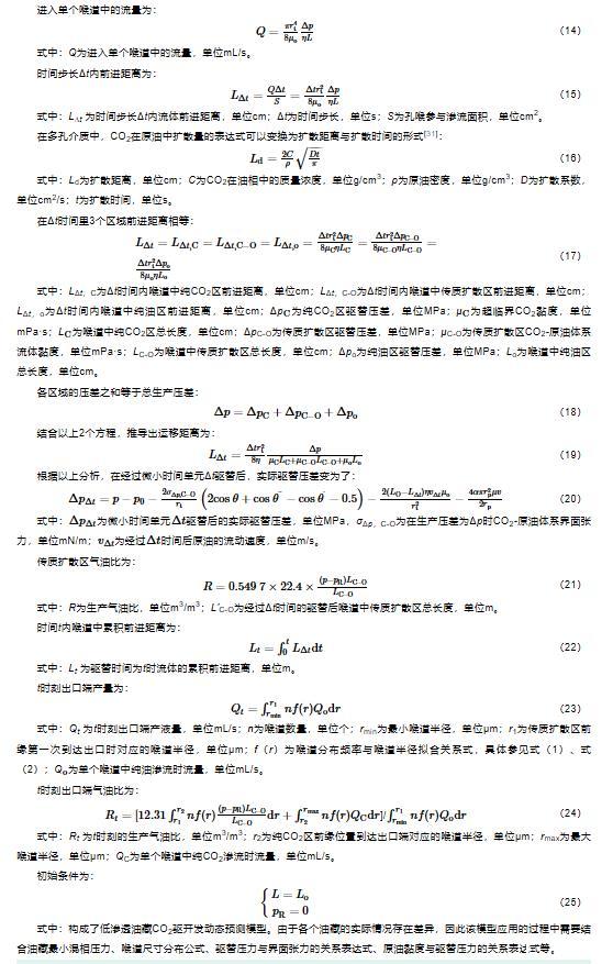 在明確巖心孔喉大小及分布的前提下,借助滲流力學(xué)基本理論,以毛管束模型為基礎(chǔ),運(yùn)用時(shí)間節(jié)點(diǎn)分析法,分析了超臨界CO2在多孔介質(zhì)中的滲流特征,建立了低滲透油藏CO2驅(qū)開發(fā)全過(guò)程產(chǎn)量計(jì)算模型,為油田CO2驅(qū)開發(fā)動(dòng)態(tài)預(yù)測(cè)、效果評(píng)價(jià)和剩余油表征提供理論支撐,指導(dǎo)油田進(jìn)行開發(fā)政策的調(diào)整。