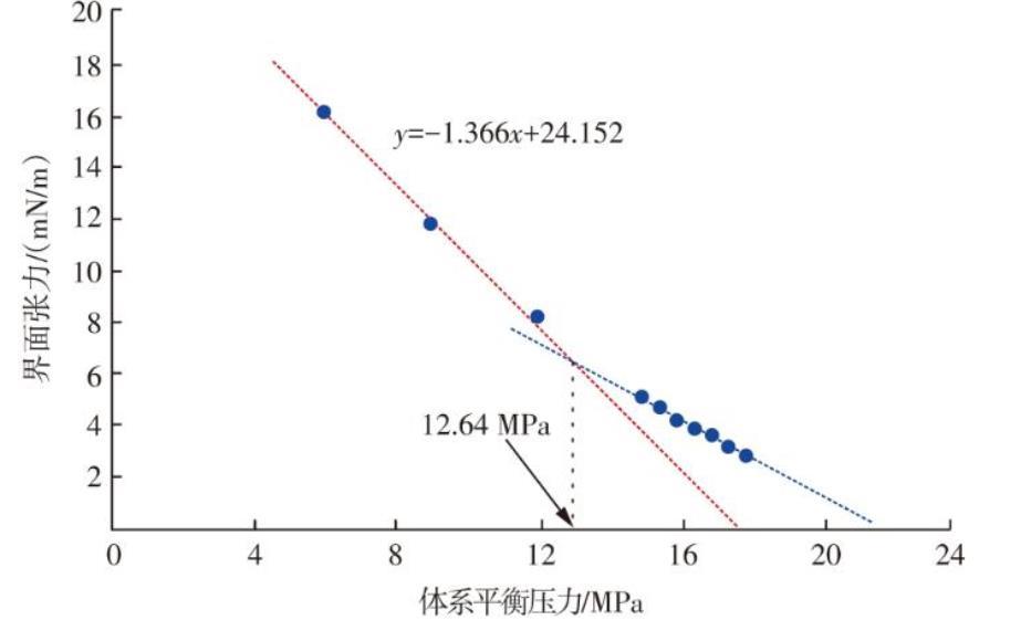 如圖2所示,懸滴法測(cè)試結(jié)果表明:當(dāng)體系平衡壓力<12.64 MPa時(shí),界面張力隨體系平衡壓力的增大而快速減小,其線性擬合的直線與X軸交點(diǎn)位于17.56 MPa,該體系平衡壓力為多級(jí)接觸最小混相壓力;當(dāng)體系平衡壓力≥12.64 MPa時(shí),界面張力減小幅度變緩,線性擬合的直線與X軸交點(diǎn)位于21.63 MPa,代表了CO2與原油一次接觸最小混相壓力。