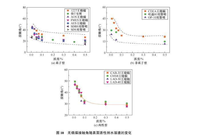 圖9低揮發分煙煤接觸角隨表面活性劑水溶液的變化