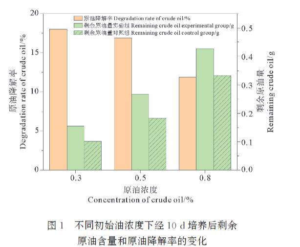 圖1不同初始油濃度下經(jīng)10d培養(yǎng)后剩余原油含量和原油降解率的變化