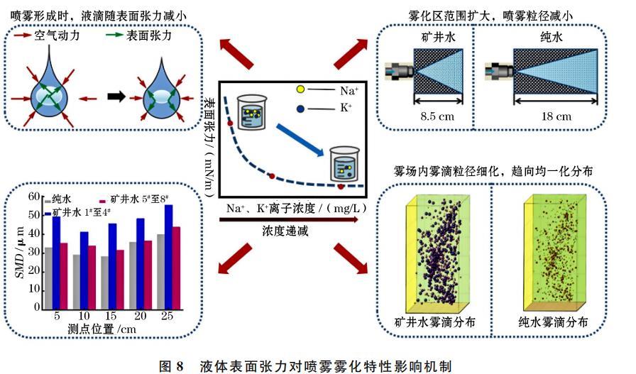 結合試驗結果,得到礦井水Na+、K+濃度對噴霧霧化特性的影響機制如圖8所示。溶液中Na+、K+等離子濃度通過改變其表面張力,間接影響噴霧霧場性能。當溶液中Na+、K+等離子濃度減小,氣-水界面對離子排斥作用減弱,導致溶液表面張力減小。