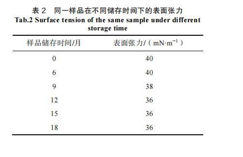 在溫度為23℃、相對濕度為60%的環境下,測試樣品在不同儲存時間下的表面張力,測得數據見表2。由表2可知,樣品轉移涂層剛開始成膜時的表面張力為40 mN/m,且樣品儲存6個月以內的表面張力基本保持不變。7—9個月出現衰退,降低為38 mN/m,符合真空噴鋁紙行業標準(BB/T 0054—2010)。儲存12個月至18個月的紙樣表面張力僅為36 mN/m,但并未在儲存18個月時出現進一步的明顯降低。顯然,紙樣的表面張力緩慢降低并不能解釋2.1節中出現的18個月印刷油墨與轉移涂層的附著力差的問題。再根據相關研究,表面張力≥38 mN/m的要求,并不直接適用于轉移紙印刷的質量控制,特別是用于UV膠印的真空噴鋁轉移紙的轉移涂層。膠印印刷適應性并不完全由表面張力所決定。