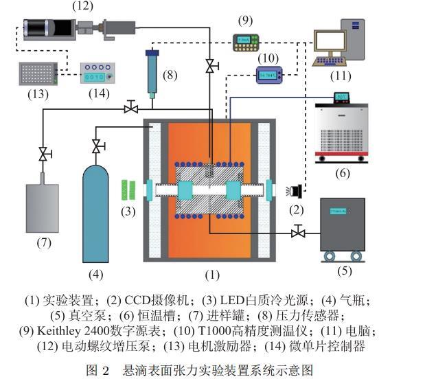 本文所搭建的懸滴法表面張力實驗系統的溫度和壓力適用范圍為 223.15 ~ 373.15 K 和 0 ~ 15 MPa。實驗系統示意圖如圖 2 所示,其主要包括實驗裝置本體、恒溫槽、溫度控制與測量系統、氣體增壓與壓力測量系統、液滴控制系統、真空系統、圖像采集和數據處理系統。