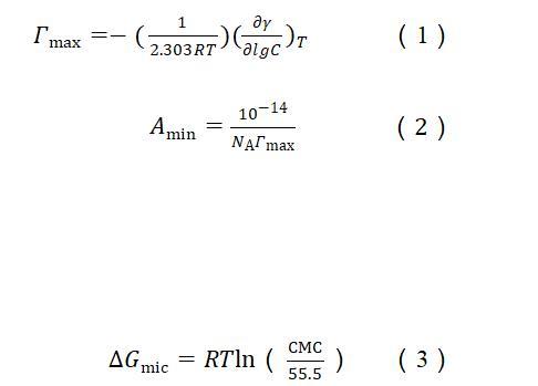 根據表面張力和濃度的關系曲線,使用吉布斯吸附等溫線〔方程(1)〕計算出表面活性劑分子吸附在氣液界面的最大表面過剩濃度(Гmax)。