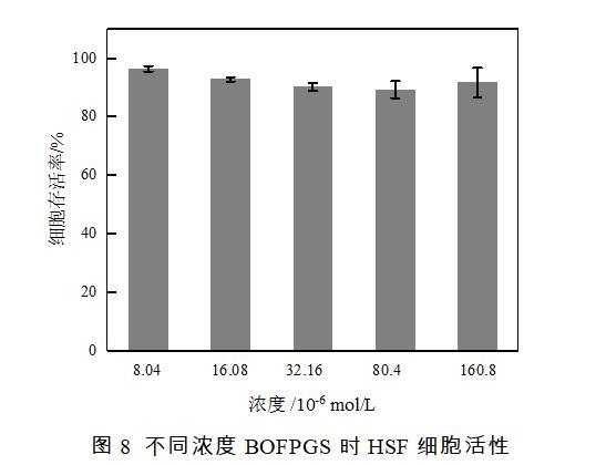 表面活性劑的毒理性質是評價表面活性劑安全性的重要參數,采用MTT法來測試BOFPGS對細胞活性的影響。將濃度梯度為8.04×10-6 1.6×10-4 mol/L(5~100 mg/L)的BOFPGS加入到96孔板中培養HSF細胞24 h,細胞活性變化情況如圖8所示。從圖8可以看出,HSF細胞在BOFPGS濃度為8.04×10-6 1.6×10-4 mol/L作用下其細胞活性都在90%以上。說明在8.04×10-6 1.6×10-4 mol/L濃度范圍內,BOFPGS對HSF細胞沒有表現出明顯的毒性的,有望作為環保、安全的產品進行使用。