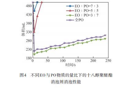 圖4不同EO與PO物質的量比下的十八醇聚醚酯消泡劑消泡性能