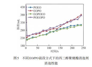 圖5不同EO/PO嵌段方式下的丙二醇聚醚酯消泡劑消泡性能