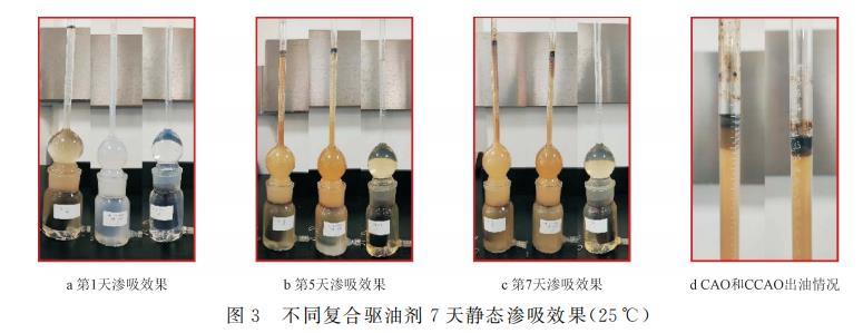 從以上分析來看,降黏增滲型驅油劑(CCAO和CAO)在靜態滲吸過程中通過降低原油黏度,提高了巖心原油的流動性及滲吸能力,其中CCAO滿足中黏原油滲吸驅油要求,靜態洗油率達到15.27%,且析出的原油不乳化,在實際生產過程中無需后續的破乳處理。