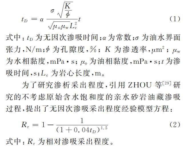 為研究黏度及界面張力對滲析采出程度的影響,引用MA等推導出的公式(1),式中同時考慮了親水系統和滲吸親油系統的無因次滲吸時間。