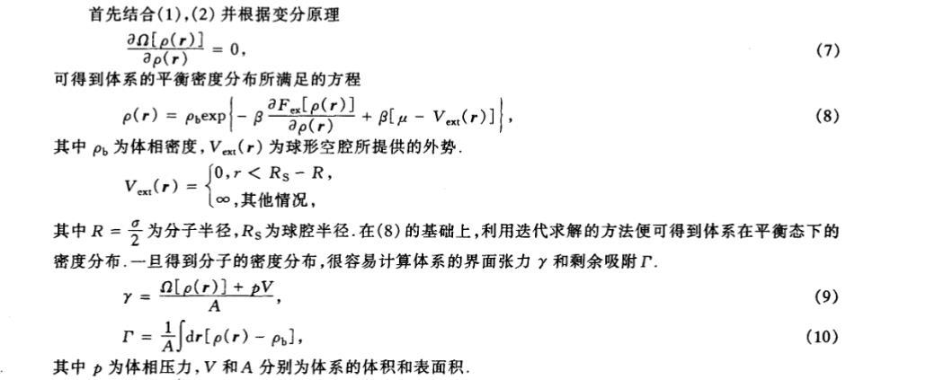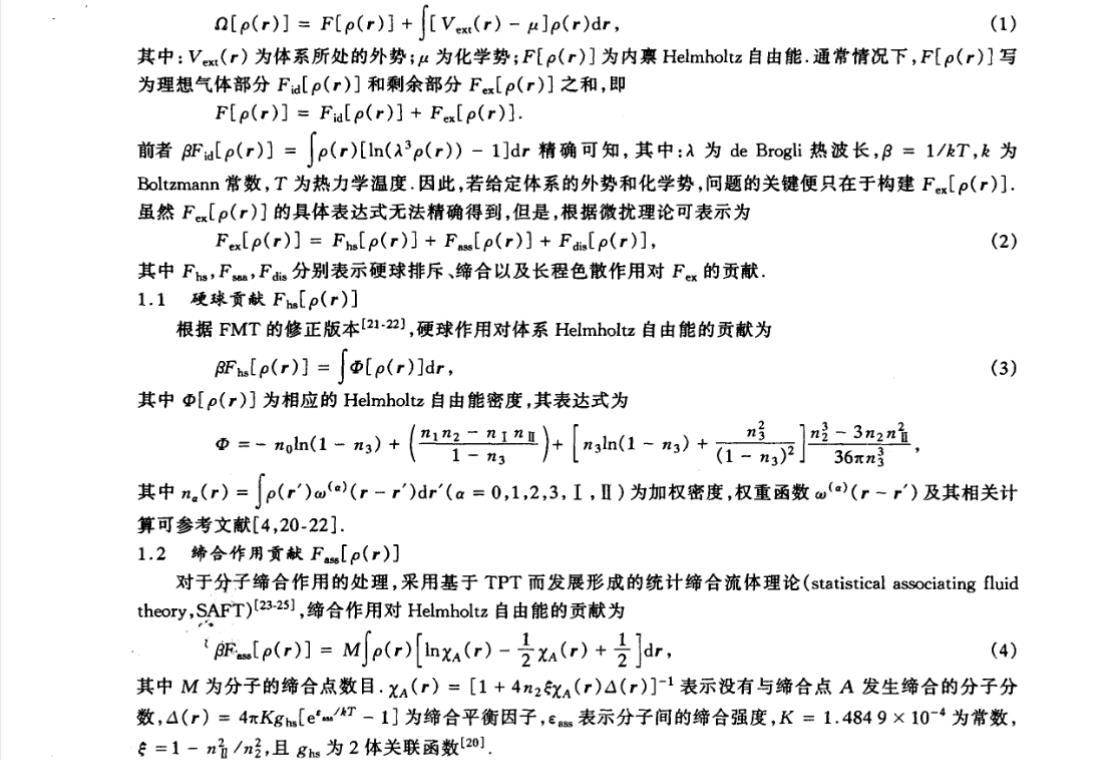 其中,n?(r)=∫ρ(r')ω???(r'?r)dr'(a=0,1,2,3,I,II)為加權密度,權重函數 ω???(r?r')及其相關計算可參考文獻。