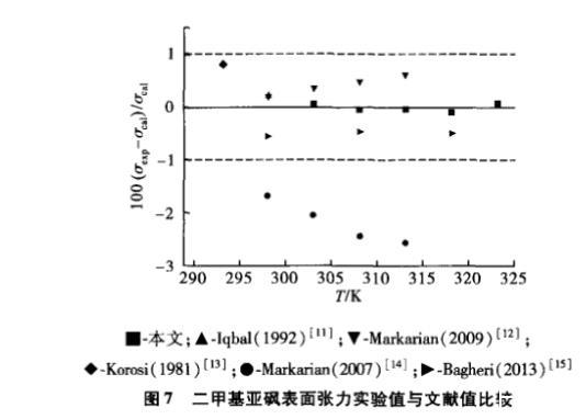 圖7 二甲基亞砜表面張力實(shí)驗(yàn)值擬合得到的方程與文獻(xiàn)實(shí)驗(yàn)值的偏差
