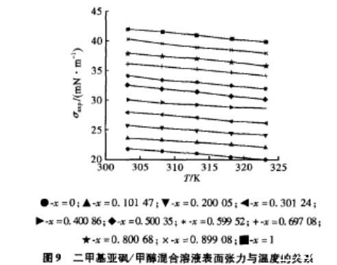 如圖9所示為不同配比下的二甲基亞砜/甲醇混合溶液表面張力與溫度關(guān)系的示意圖。由圖可知,不同配比下混合溶液的表面張力均大于相應(yīng)溫度下甲醇的表面張力,而小于相應(yīng)溫度下二甲基亞砜的表面張力;隨著溫度的升高不同配比下的二甲基亞砜/甲醇混合溶液表面張力隨溫度的升高基本呈線(xiàn)性減小的趨勢(shì);同一溫度下的二甲基亞砜/甲醇混合溶液表面張力隨二甲基亞砜摩爾分?jǐn)?shù)的增大呈現(xiàn)逐漸增大的趨勢(shì)。