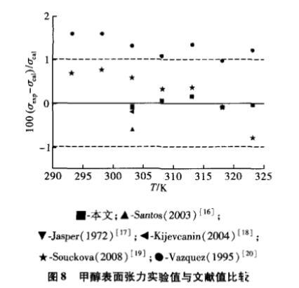 圖8為甲醇表面張力實(shí)驗(yàn)值擬合得到的方程與文獻(xiàn)實(shí)驗(yàn)值的偏差,本文數(shù)據(jù)與Santos等[15],Jasper[16],Kijevcanin等[17]和Souckova等[18]數(shù)據(jù)吻合得較好,與Vazquez等[19]數(shù)據(jù)偏差稍大,最大偏差為1.6%。