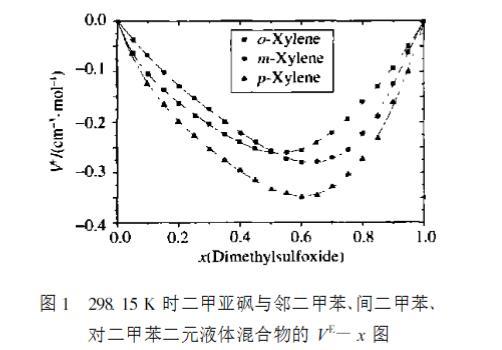 從圖1 可以看出,在298.15 K 時,二甲亞砜+鄰二甲苯、二甲亞砜+間二甲苯、二甲亞砜+對二甲苯共3 個二元混合物在全濃度范圍內過量體積為負值,在最小值處大小順序為:鄰二甲苯>間二甲苯>對二甲苯。二甲亞砜是極性分子,存在 SO基團,是電子的受體;二甲苯分子中存在著大 π鍵,是電子授體,電子受體與電子授體之間形成 n -π配鍵,屬于弱化學作用,從而使他們組成的混合物體積收縮,過量體積呈現負偏差。