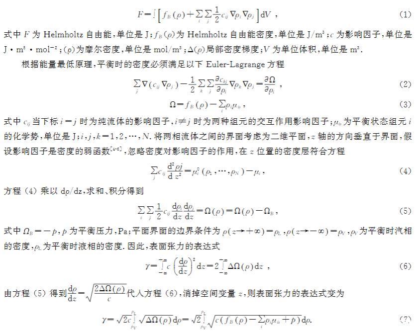 vanderWaals首先提出了密度梯度理論,并將該理論用于氣液界面,通過對(duì)氣液界面的研究得出結(jié)論,界面處的密度變化是連續(xù)的,后來(lái)該理論被Cahn和Hilliard完善。該理論中,界面的Helmholtz自由能密度為兩部分的加和:均相部分和非均相部分。Helmholtz自由能密度Taylor級(jí)數(shù)的二階展開式為