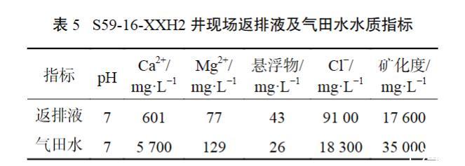 表5 S59-16-XXH2井現(xiàn)場返排液及氣田水水質(zhì)指標(biāo)