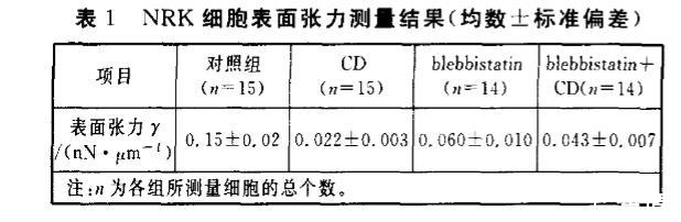實驗中,分別單獨加入骨架蛋白抑制劑2μmol/L CD和30μmol/L blebbistatin,再同時加入2μmol/L CD和30μmol/L blebbistatin。各組細(xì)胞處理15~20 min后進行細(xì)胞表面張力測量。利用公式(1)計算細(xì)胞表面張力,實驗結(jié)果見表1。