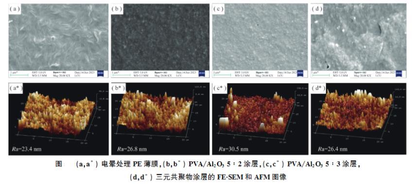 涂覆PVA/Al?O?后,表面變得更為粗糙,Al?O?納米顆粒均勻分散在PVA基質(zhì)中,形成了微納復(fù)合結(jié)構(gòu)。AFM測得的粗糙度(Ra)順序為:PVA/Al?O?5:3>5:2>AHB三元共聚物>電暈PE。
