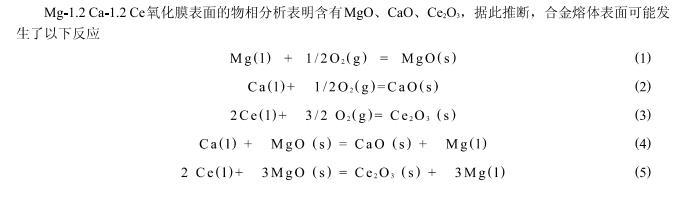 這種氧化膜結構的明顯不同可以很好的解釋阻燃效果之間的差異.歸其原因,主要是由于,在沒有添加任何Ce元素的情況下,不論形成的MgO薄膜還是CaO薄膜,由于其致密度較低,因此不能夠完全阻止氧的進一步擴散;相反,在添加了較多元素的Ce后,不但可以形成更加致密的復合的氧化膜,而且Ce2O3比較致密,不但可以很好的隔絕氧的進一步擴散,而且還能夠添補許多裂紋,因此,具有很好的阻燃效果.