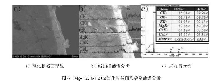 4)通過氧化膜的截面檢測和熱力學計算分析得出Mg-1.2Ca-1.2Ce的形成的氧化膜大致分為3層:外層是MgO,中間層是CaO,內層是Ce2O3。