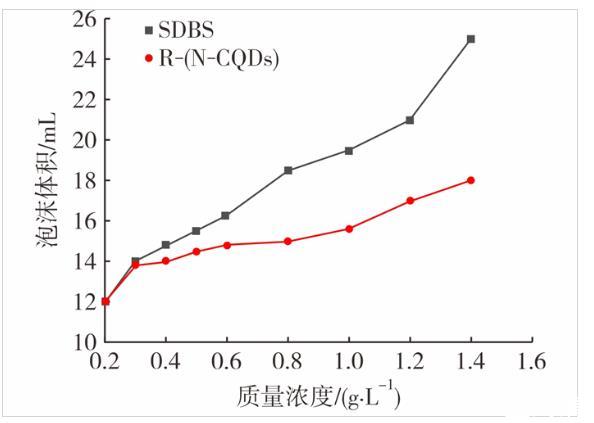 從圖7可看出,R-(N-CQDs)的起泡能力表現不佳,雖然在高質量濃度下其起泡能力相比低質量濃度時有一定的提高,但是相對于SDBS的起泡能力仍存在較大的差距,這與R-(N-CQDs)自身結構有關,SDBS是直鏈結構,而R-(N-CQDs)結構上存在很多支鏈,形成泡沫時需要克服更多的表面能做功,所以形成的泡沫比SDBS更少。