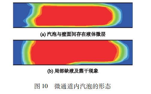 圖10a中汽泡與加熱壁面間存在一定厚度的液體微層,由壁面導出的熱量使微層內(nèi)的液體迅速汽化,吸收汽化潛熱,實現(xiàn)熱質(zhì)的快速遷移。因此,壁面不會出現(xiàn)局部異常過熱(圖9d中III處);圖10b則不同,汽泡與壁面間的液體微層不連續(xù),局部出現(xiàn)缺液,發(fā)生干涸,汽相充斥于壁面附近,近壁區(qū)傳熱熱阻顯著增加,導致壁面熱量難以轉移,壁溫迅速升高,以局部干涸點處的壁溫為溫度最高點,向鄰近區(qū)域發(fā)生熱量擴散,形成圖9d中I,II處的溫度梯度。比較發(fā)現(xiàn):相對于σ為0.059 N·m?1,σ為0.035 N·m?1時微通道內(nèi)的局部異常過熱區(qū)域減少約3/4,最高過熱溫差ΔT降低約600 K,換熱更可靠、安全。