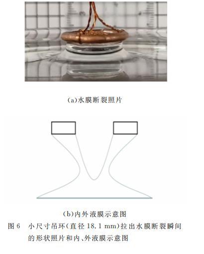 另一方面,對于尺寸較小的吊環(huán),如圖6所示,水膜的內(nèi)表面將連接在一起,只有外表面的表面張力起作用,但在計(jì)算公式中,仍以2πd?代入式(5)中,所以表面張力系數(shù)的計(jì)算值偏小。標(biāo)準(zhǔn)環(huán)的尺寸適中,環(huán)壁很薄,所以圖1(c)與圖1(d)水膜形狀近似相同,實(shí)際測量的F等于U斷前,因此計(jì)算得到的α2誤差很小。可見,選用水膜斷裂點(diǎn)計(jì)算的表面張力系數(shù)的影響因素很多,實(shí)際斷裂點(diǎn)的瞬間位置、吊環(huán)尺寸、吊環(huán)厚薄等都是需要考慮的因素。