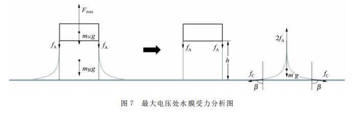 采用隔離法,對電壓最大值處的水膜進(jìn)行受力分析。圖7中虛線將水膜分成2部分,吊環(huán)正下方的水膜由于水分子相互吸引力附加在拉力Fmax中,而另一部分水膜的重力m′g,與2fA以及水膜與液面處的表面張力2fCcosβ,三者形成平衡狀態(tài),即受力分析與水膜斷裂時(shí)[圖1(d)]m2的受力相似。所以計(jì)算水膜的重力僅僅需要考慮吊環(huán)正下方的重力即可。另外,電壓最大值處的水膜穩(wěn)定性最好,拉升高度h容易測量。對于尺寸較小的吊環(huán)(πd?=78.2 mm),電壓最大值處,水膜的內(nèi)表面沒有連接在一起,仍然與液體表面接觸良好,所以測量的誤差也較小(Eα1=3.9%)。但是對于特別小的吊環(huán)(πd?=57.4 mm),水膜的內(nèi)表面連接在一起,其表面張力系數(shù)明顯偏小。