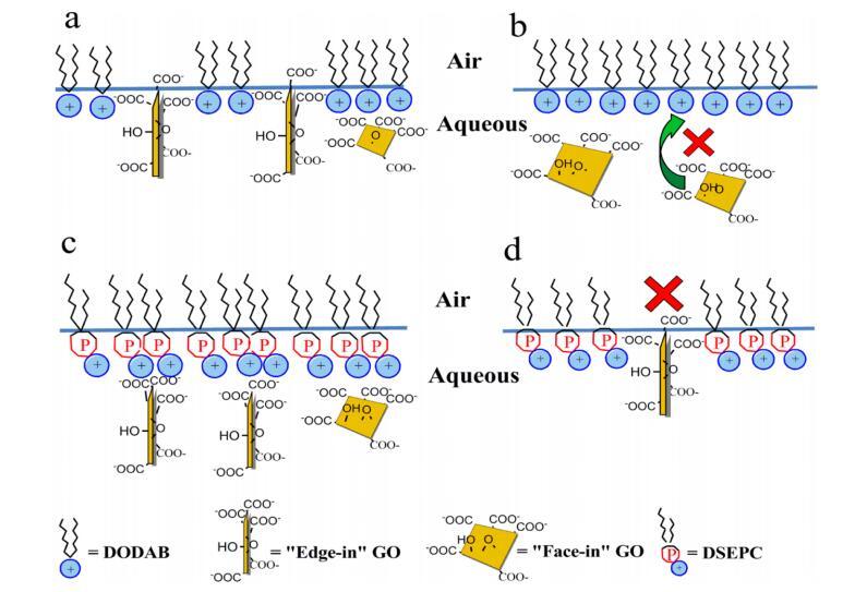 圖 3. GO 并入 DODAB (a, b) 和 DSEPC (c, d) 單層時可能取向的示意圖 氣水界面。